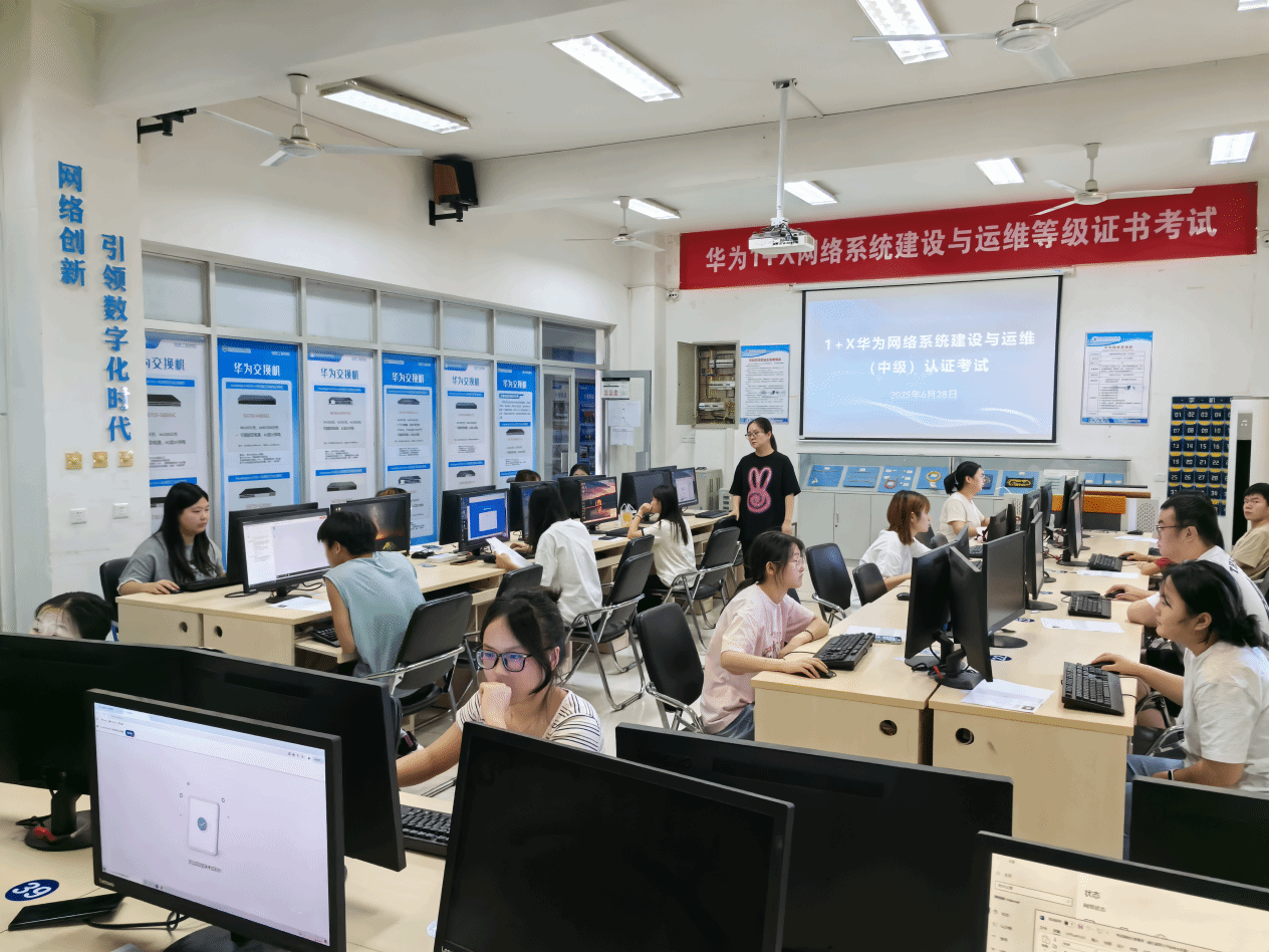 6月28日,信息工程学院开展华为“1+X”网络系统建设与运维职业技能等级证书(中级)考试。计算机应用技术专业20名学生参加考试。