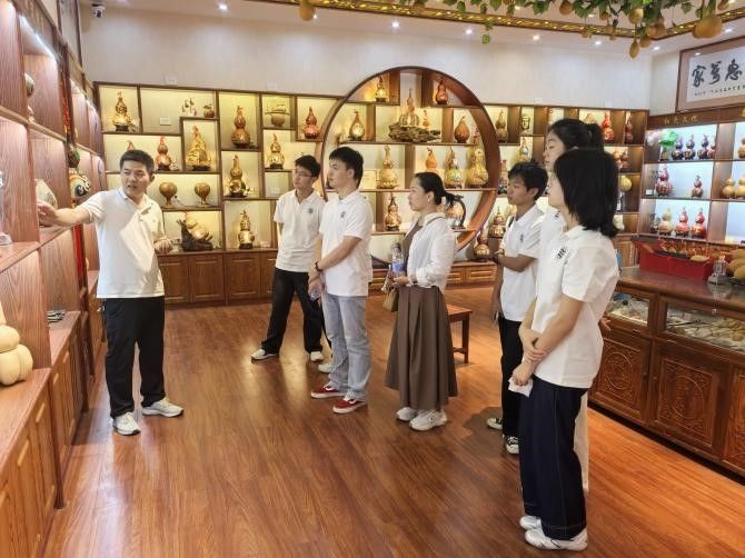 来到洽川葫芦种植专业合作社,队员们领略了“小葫芦大产业”,千余件葫芦作品令人惊叹——镂空雕刻的灯罩、彩绘民俗故事的摆件、融入现代设计的文创产品,展现了传统工艺的现代生命力。陕西省工艺美术大师、陕西省非遗保护传承人宋鹏杰将葫芦种植与非遗技艺结合,带动农户增收的故事,让队员们看到非遗产业化的潜力。