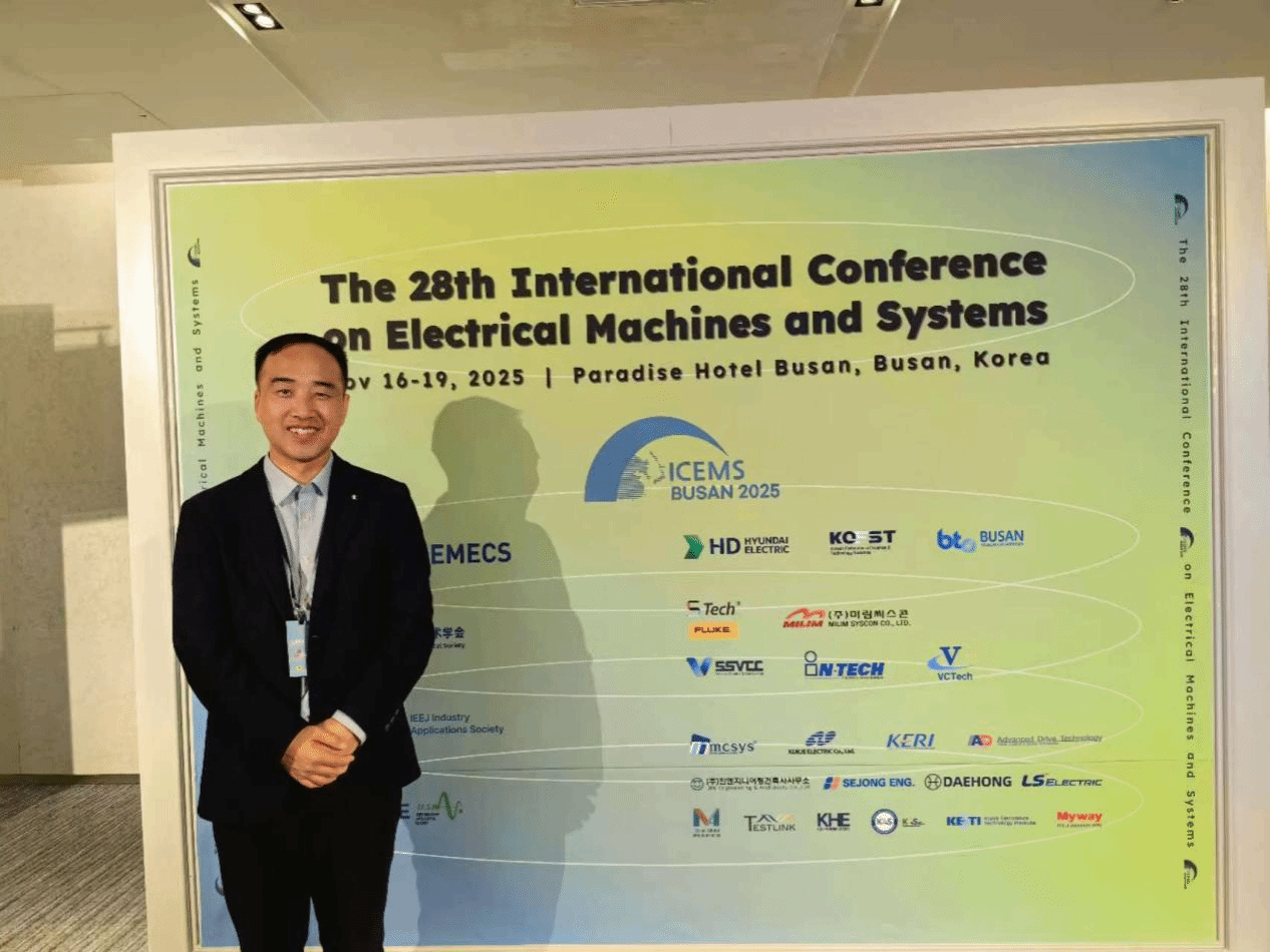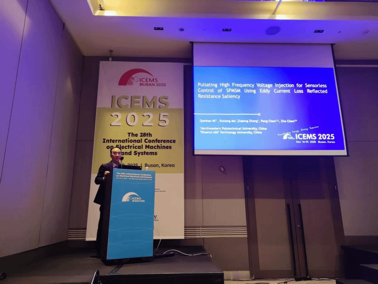 11月16日至19日,我校机电工程学院陈鹏博士赴韩国釜山,参加第28届国际电机与系统(ICEMS2025)国际会议。在分会场,他以《Pulsating High Frequency Voltage Injection for Sensorless Control of SPMSM Using Eddy Current Loss Reflected Resistance Saliency》为题作报告,分享了在永磁同步电机无位置传感器控制领域的最新研究成果。
