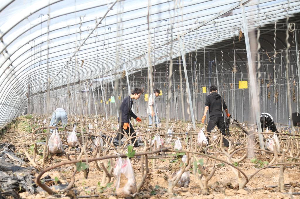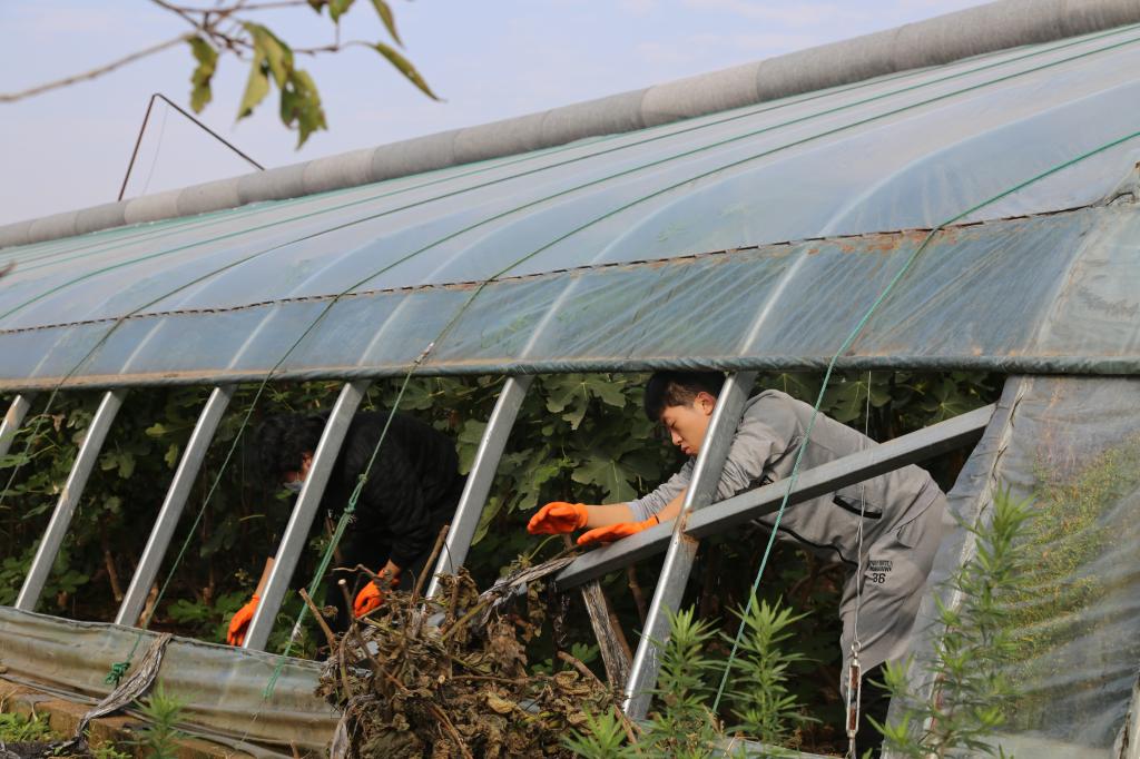 随后,学生入党积极分子进行了劳动实践。他们或是移除温室地膜,或是捡拾修剪枝条,或是搬运苗床的钢架,个个干劲十足,在劳动体会学习的快乐。