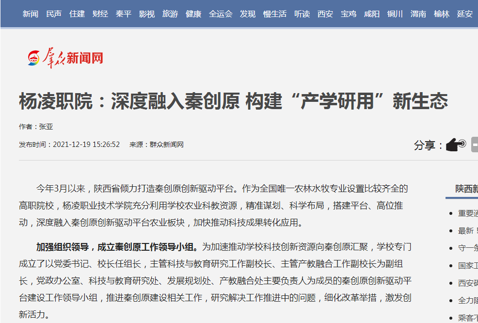 今年3月以来,陕西省倾力打造秦创原创新驱动平台。作为全国唯一农林水牧专业设置比较齐全的高职院校,杨凌职业技术学院充分利用学校农业科教资源,精准谋划、科学布局,搭建平台、高位推动,深度融入秦创原创新驱动平台农业板块,加快推动科技成果转化应用。