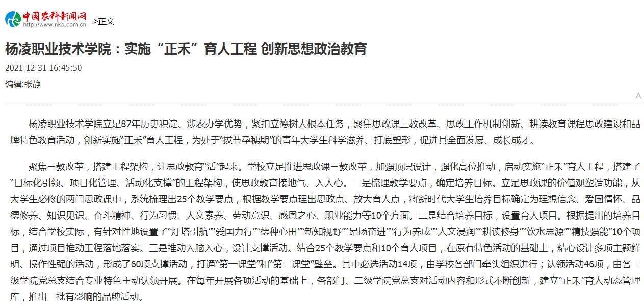 【中国农科新闻网】杨凌职业技术学院:实施“正禾”育人工程 创新思想政治教育