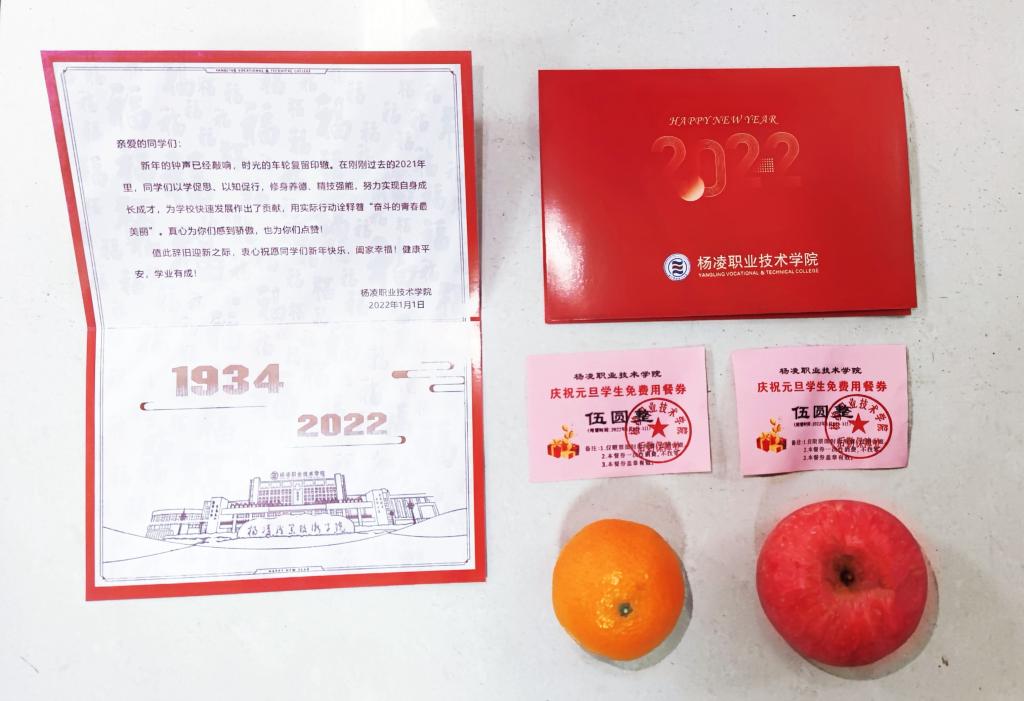 2021年12月31日晚,伴随着2022年走来的脚步声,杨凌职业技术学院为同学们送上特别准备的新年祝福,校领导们为每一位同学送上精心制作的新年贺卡、寓意平安的苹果、寓意吉祥的橘子和两张餐券,让学生们感受到了浓浓的关爱和节日气氛。