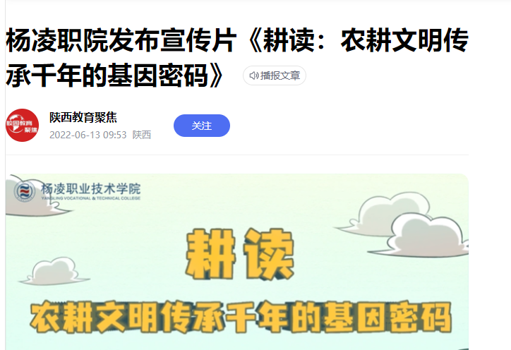 下一条:【陕西头条】杨凌职院发布动画宣传片《耕读:农耕文明传承千年的基因密码》