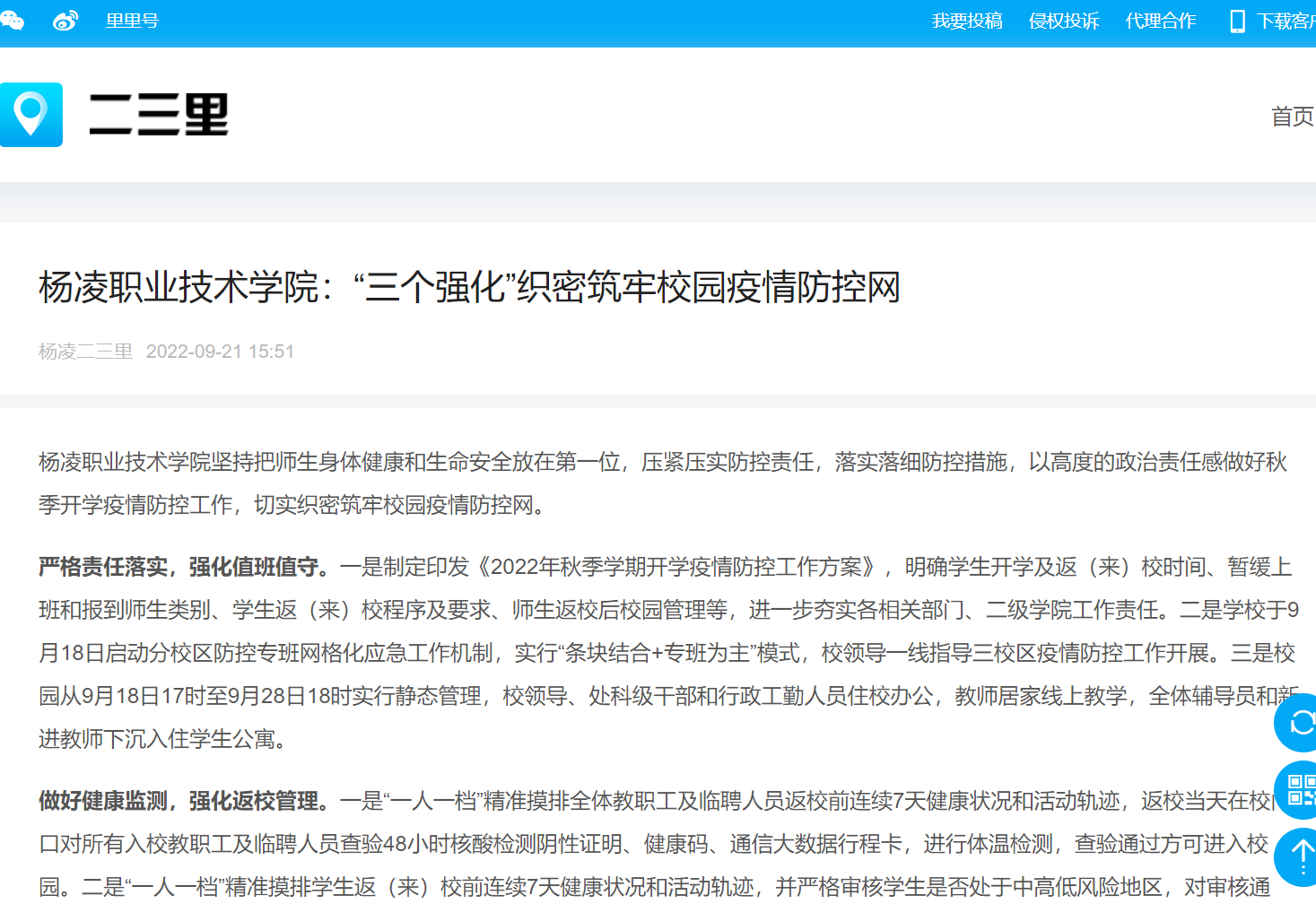 杨凌职业技术学院坚持把师生身体健康和生命安全放在第一位,压紧压实防控责任,落实落细防控措施,以高度的政治责任感做好秋季开学疫情防控工作,切实织密筑牢校园疫情防控网。