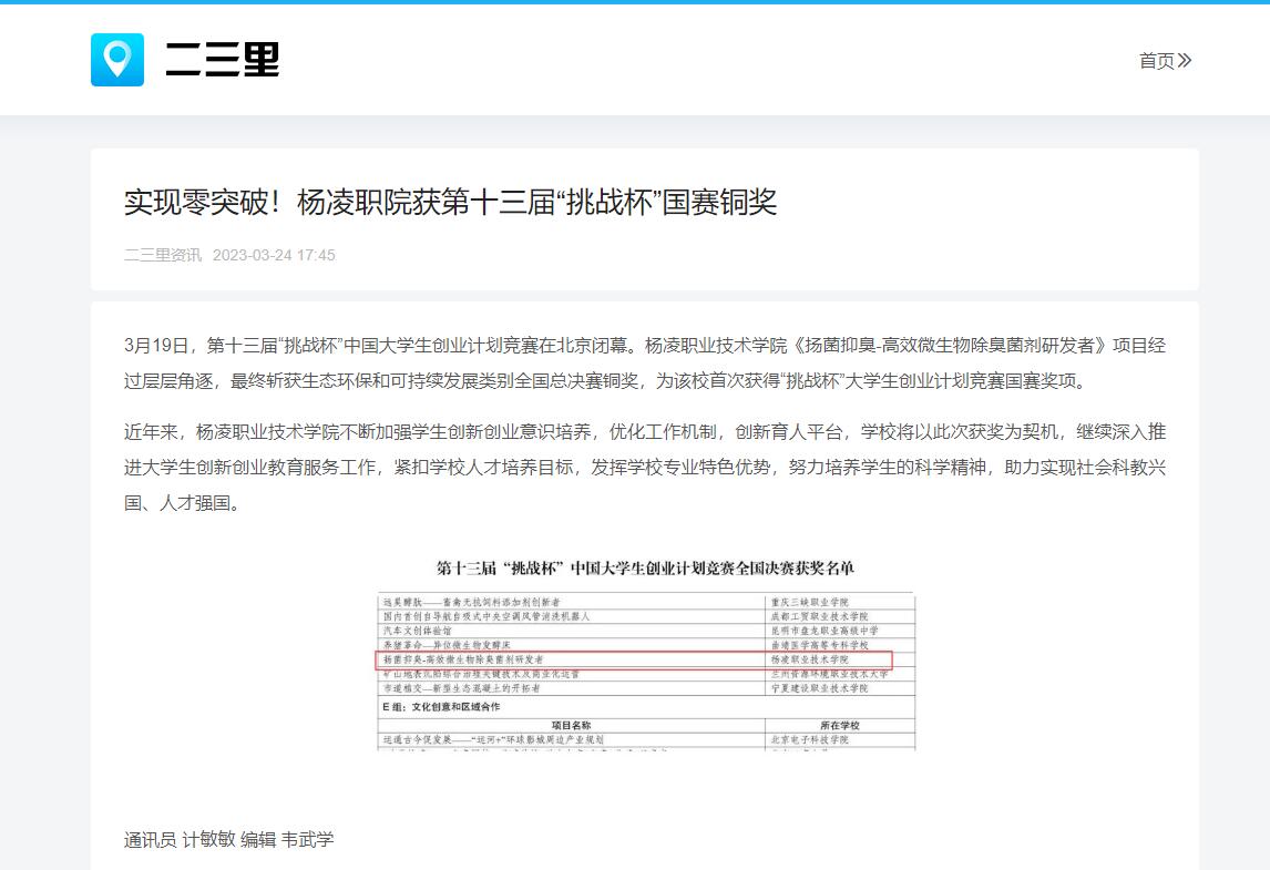 3月19日,第十三届“挑战杯”中国大学生创业计划竞赛在北京闭幕。杨凌职业技术学院《扬菌抑臭-高效微生物除臭菌剂研发者》项目经过层层角逐,最终斩获生态环保和可持续发展类别全国总决赛铜奖,为该校首次获得“挑战杯”大学生创业计划竞赛国赛奖项。