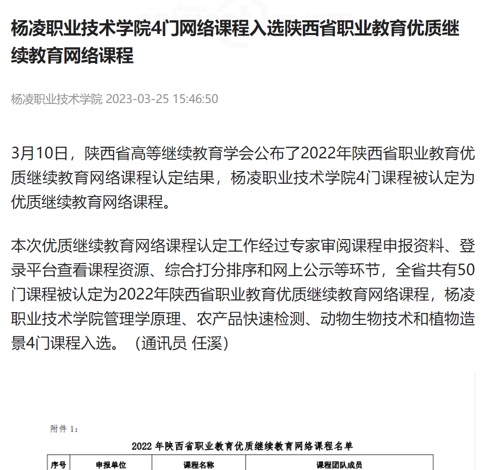 本次优质继续教育网络课程认定工作经过专家审阅课程申报资料、登录平台查看课程资源、综合打分排序和网上公示等环节,全省共有50门课程被认定为2022年陕西省职业教育优质继续教育网络课程,杨凌职业技术学院管理学原理、农产品快速检测、动物生物技术和植物造景4门课程入选。(通讯员 任溪)