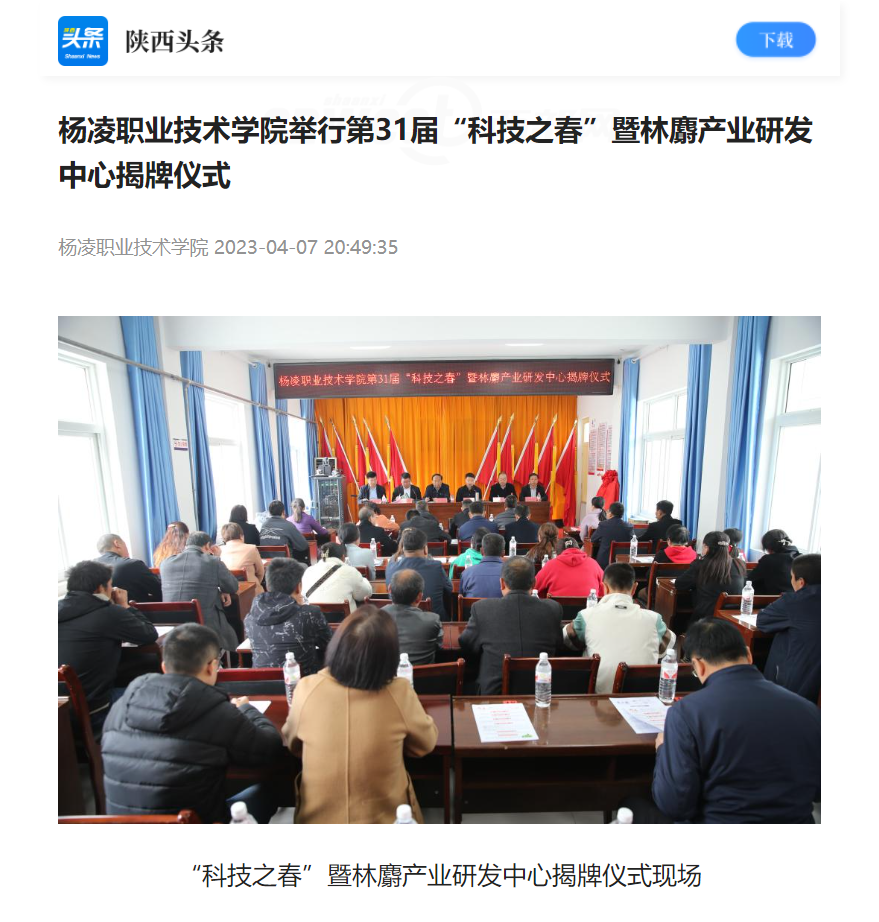 4月7日,杨凌职业技术学院第31届“科技之春”暨林麝产业研发中心揭牌仪式在凤县平木镇举行。杨凌职业技术学院党委书记王周锁、科技与教育研究处处长冯旭,凤县县长蒋铃、副县长赵少宁,以及凤县相关部门负责人、平木镇党政领导、种养殖户代表等参加活动。