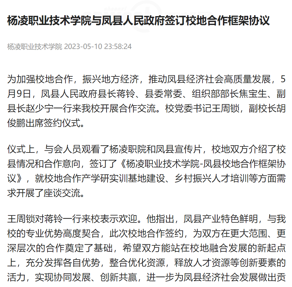仪式上,与会人员观看了杨凌职院和凤县宣传片,校地双方介绍了校县情况和合作意向,签订了《杨凌职业技术学院-凤县校地合作框架协议》,就校地合作产学研实训基地建设、乡村振兴人才培训等方面需求开展了座谈交流。