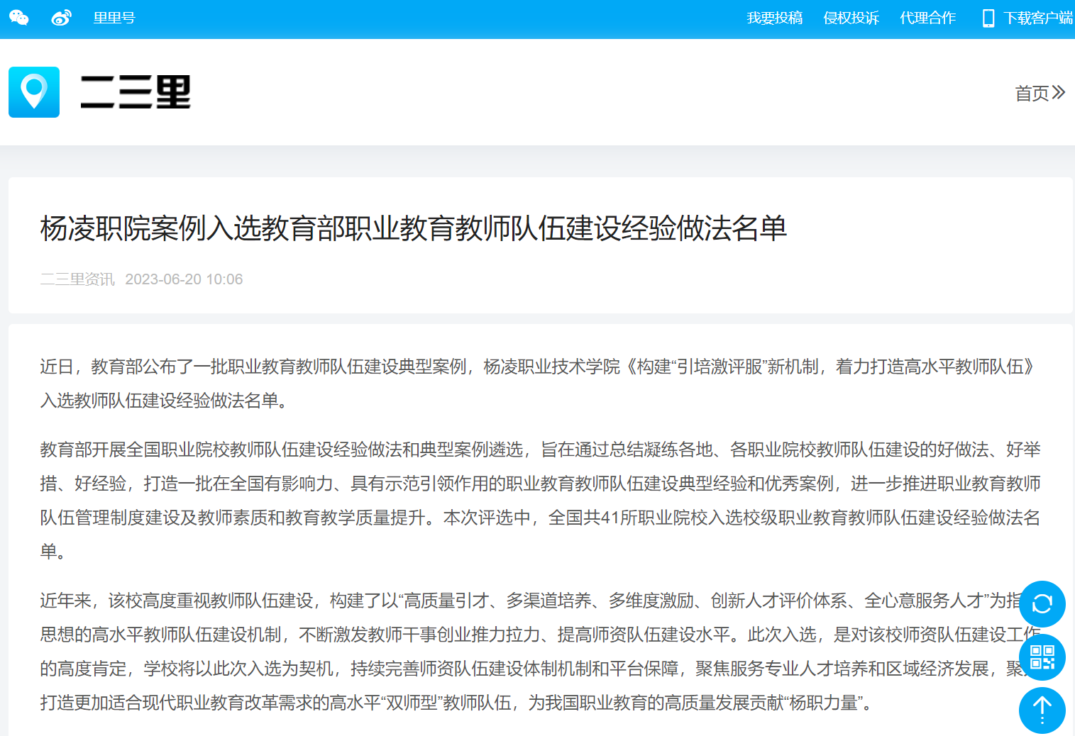 近日,教育部公布了一批职业教育教师队伍建设典型案例,杨凌职业技术学院《构建“引培激评服”新机制,着力打造高水平教师队伍》入选教师队伍建设经验做法名单。