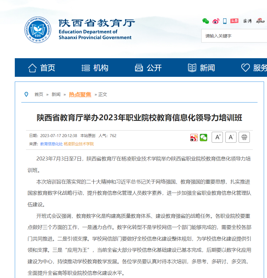 2023年7月3日至7日,陕西省教育厅在杨凌职业技术学院举办陕西省职业院校教育信息化领导力培训班。