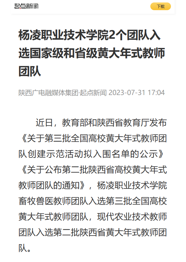 近日,教育部和陕西省教育厅发布《关于第三批全国高校黄大年式教师团队创建示范活动拟入围名单的公示》《关于公布第二批陕西省高校黄大年式教师团队的通知》,杨凌职业技术学院畜牧兽医教师团队入选第三批全国高校黄大年式教师团队,现代农业技术教师团队入选第二批陕西省黄大年式教师团队。