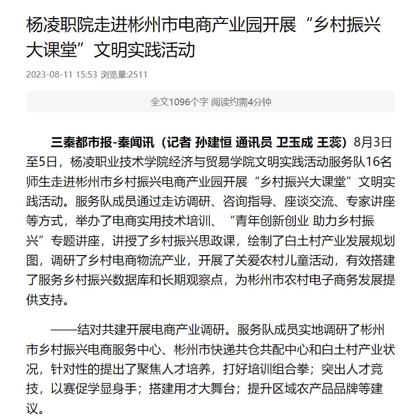 三秦都市报-秦闻讯(记者 孙建恒 通讯员 卫玉成 王蕊)8月3日至5日,杨凌职业技术学院经济与贸易学院文明实践活动服务队16名师生走进彬州市乡村振兴电商产业园开展“乡村振兴大课堂”文明实践活动。服务队成员通过走访调研、咨询指导、座谈交流、专家讲座等方式,举办了电商实用技术培训、“青年创新创业 助力乡村振兴”专题讲座,讲授了乡村振兴思政课,绘制了白土村产业发展规划图,调研了乡村电商物流产业,开展了关爱农村儿童活动,有效搭建了服务乡村振兴数据库和长期观察点,为彬州市农村电子商务发展提供支持。