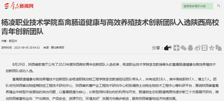 8月29日,陕西省教育厅公布了2023年度陕西高校青年创新团队入选名单,杨凌职业技术学院李龙教授牵头的畜禽肠道健康与高效养殖技术创新团队成功入选。