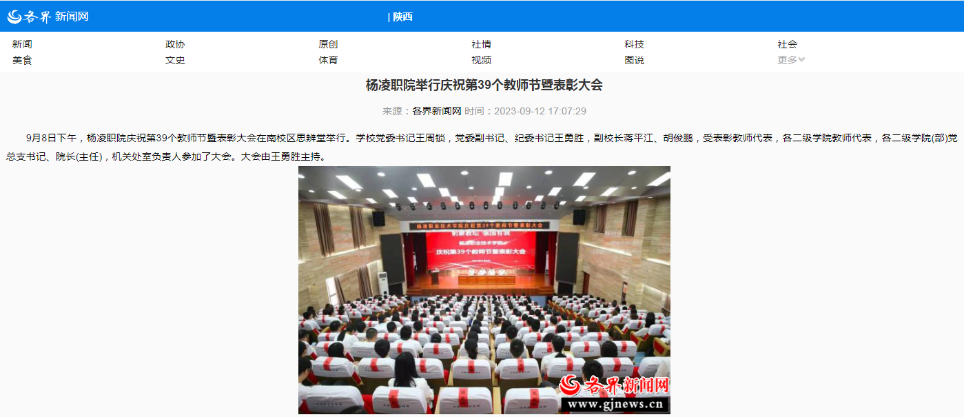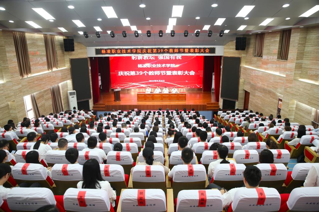 9月8日下午,杨凌职业技术学院庆祝第39个教师节暨表彰大会在南校区思辨堂举行。党委书记王周锁,党委副书记、纪委书记王勇胜,副校长蒋平江、胡俊鹏,受表彰教师代表,各二级学院教师代表,各二级学院(部)党总支书记、院长(主任),机关处室负责人参加了大会。大会由王勇胜主持。