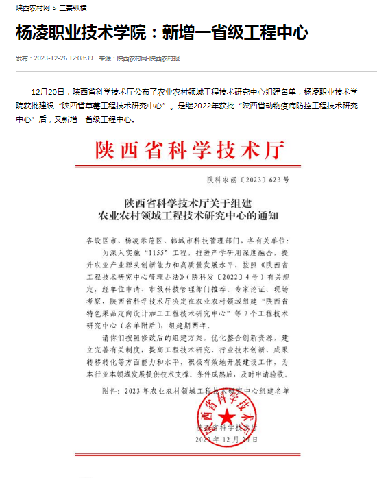 12月20日,陕西省科学技术厅公布了农业农村领域工程技术研究中心组建名单,杨凌职业技术学院获批建设“陕西省草莓工程技术研究中心”。是继2022年获批“陕西省动物疫病防控工程技术研究中心”后,又新增一省级工程中心。
