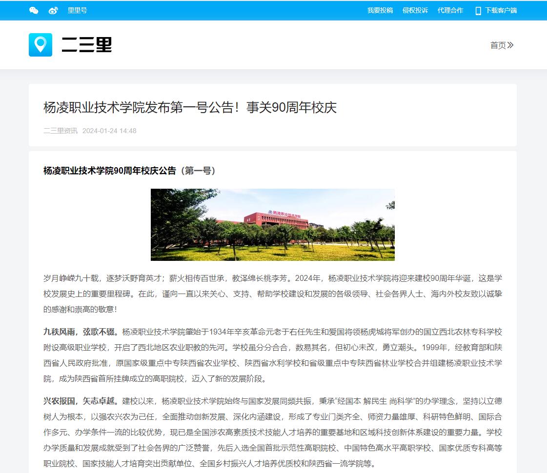 岁月峥嵘九十载,逐梦沃野育英才;薪火相传百世承,教泽绵长桃李芳。2024年,杨凌职业技术学院将迎来建校90周年华诞,这是学校发展史上的重要里程碑。在此,谨向一直以来关心、支持、帮助学校建设和发展的各级领导、社会各界人士、海内外校友致以诚挚的感谢和崇高的敬意!