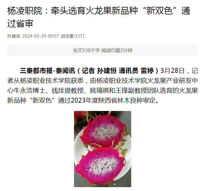 3月28日,记者从杨凌职业技术学院获悉,由杨凌职业技术学院火龙果产业研发中心牛永浩博士、钱拴提教授、姚瑞祺和王锋副教授团队选育的火龙果新品种“新双色”通过2023年度陕西省林木良种审定。