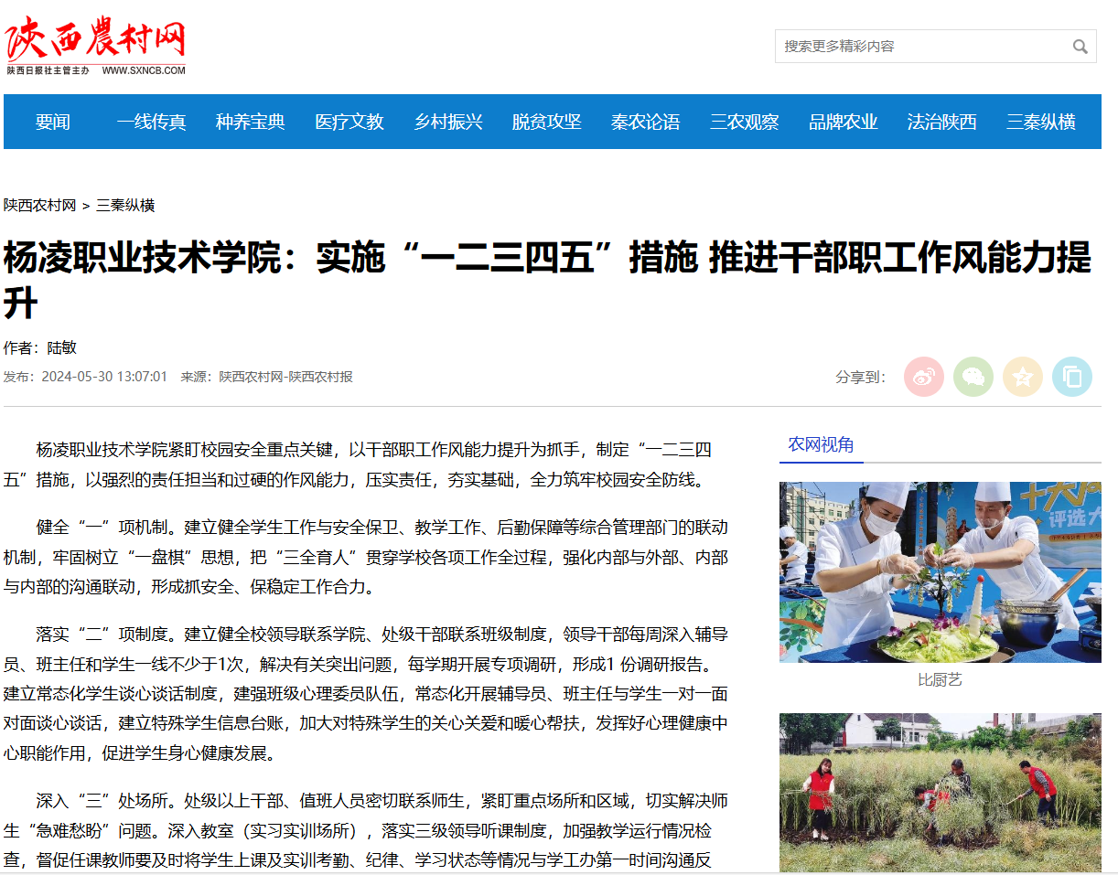杨凌职业技术学院紧盯校园安全重点关键,以干部职工作风能力提升为抓手,制定“一二三四五”措施,以强烈的责任担当和过硬的作风能力,压实责任,夯实基础,全力筑牢校园安全防线。