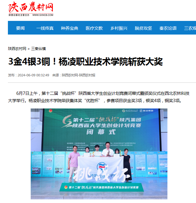 6月7日上午,第十二届“挑战杯”陕西省大学生创业计划竞赛闭幕式暨颁奖仪式在西北农林科技大学举行。杨凌职业技术学院荣获集体奖“优胜杯”,参赛项目获金奖3项,银奖4项,铜奖3项。