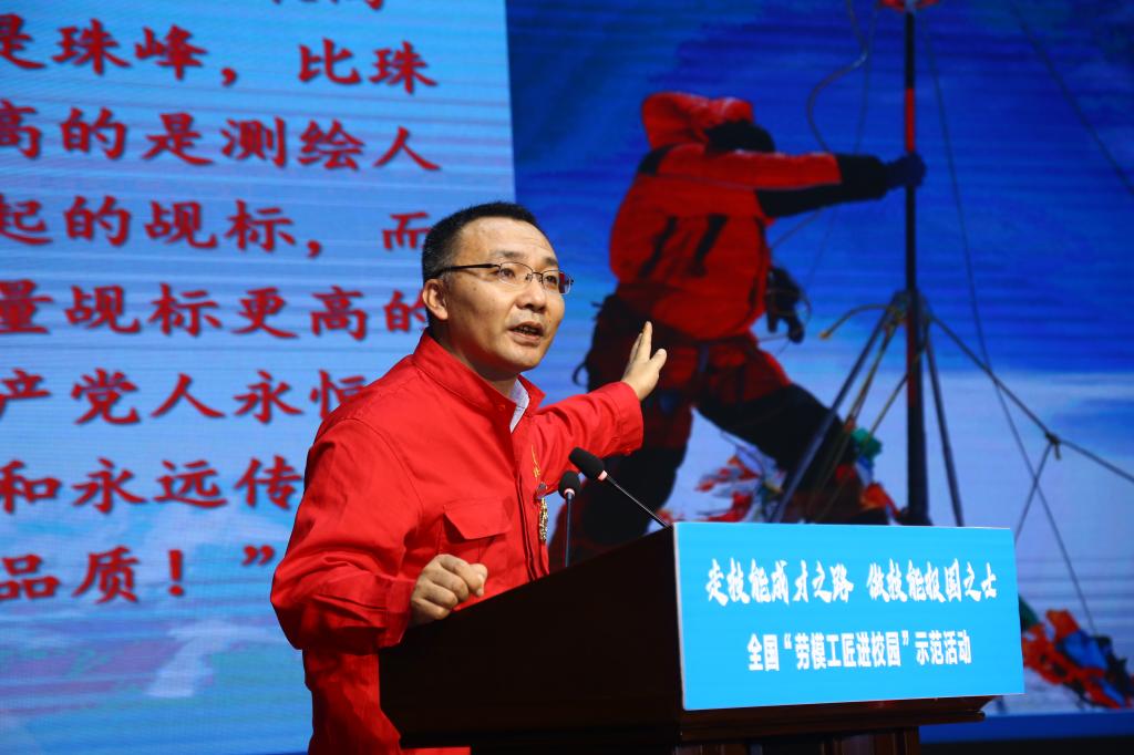 为使学生近距离接触劳模工匠,杨峰现场展示了用电钻在气球上给A4纸打孔的绝活,精湛的技艺引来阵阵掌声。任秀波与师生热情交流互动,送上珠峰勘测专用纪念品和相关资料,并鼓励师生以劳动创造幸福,握紧接力棒,走好奋斗路。