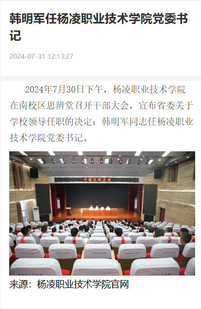 2024年7月30日下午,杨凌职业技术学院在南校区思辨堂召开干部大会,宣布省委关于学校领导任职的决定:韩明军同志任杨凌职业技术学院党委书记。