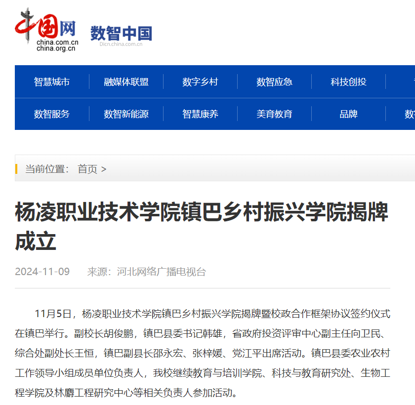 11月5日,杨凌职业技术学院镇巴乡村振兴学院揭牌暨校政合作框架协议签约仪式在镇巴举行。副校长胡俊鹏,镇巴县委书记韩雄,省政府投资评审中心副主任向卫民、综合处副处长王恒,镇巴副县长邵永宏、张梓媛、党江平出席活动。镇巴县委农业农村工作领导小组成员单位负责人,我校继续教育与培训学院、科技与教育研究处、生物工程学院及林麝工程研究中心等相关负责人参加活动。