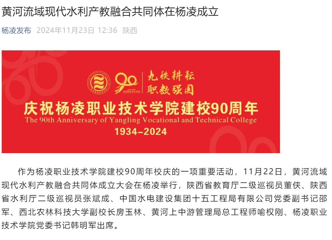 黄河流域现代水利产教融合共同体是以中国水电建设集团十五工程局有限公司、西北农林科技大学、杨凌职业技术学院为牵头单位,联合黄河流域10余个省市上下游企业、院校、行业组织和科研机构等40余家单位共同组建成立。