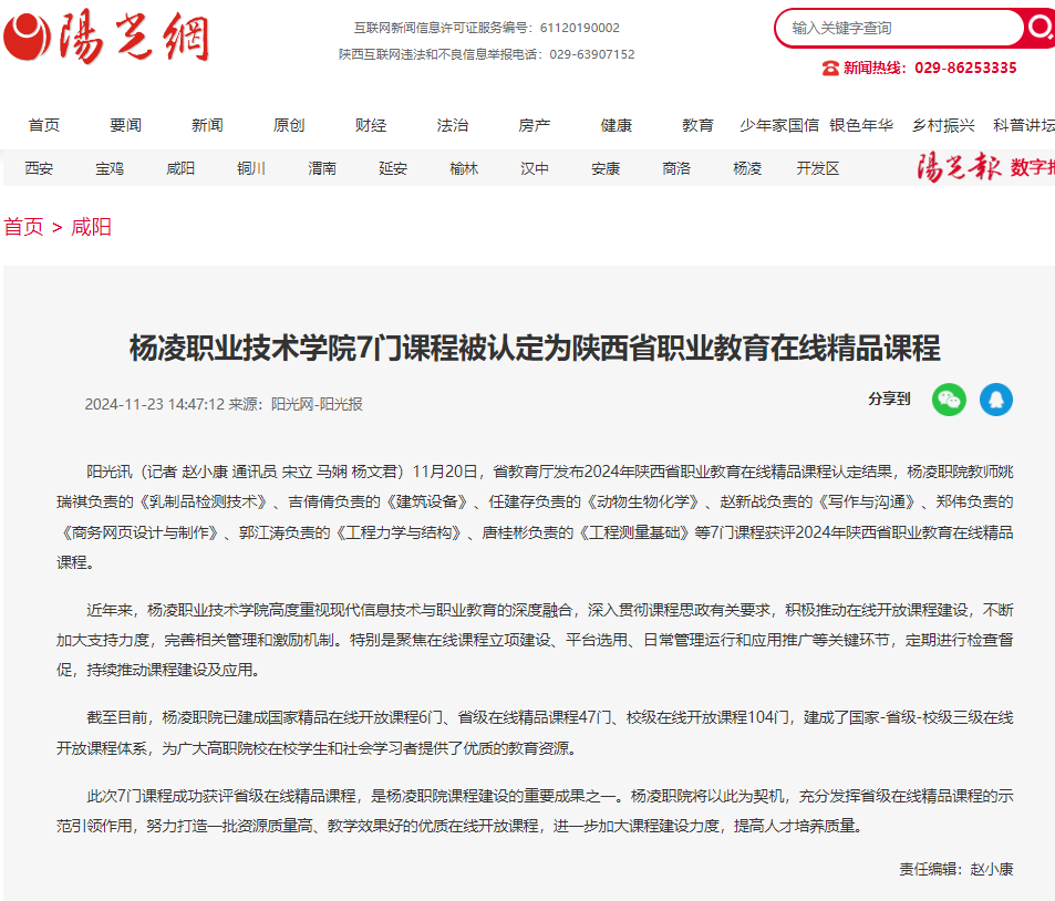 阳光讯(记者 赵小康 通讯员 宋立 马娴 杨文君)11月20日,省教育厅发布2024年陕西省职业教育在线精品课程认定结果,杨凌职院教师姚瑞祺负责的《乳制品检测技术》、吉倩倩负责的《建筑设备》、任建存负责的《动物生物化学》、赵新战负责的《写作与沟通》、郑伟负责的《商务网页设计与制作》、郭江涛负责的《工程力学与结构》、唐桂彬负责的《工程测量基础》等7门课程获评2024年陕西省职业教育在线精品课程。