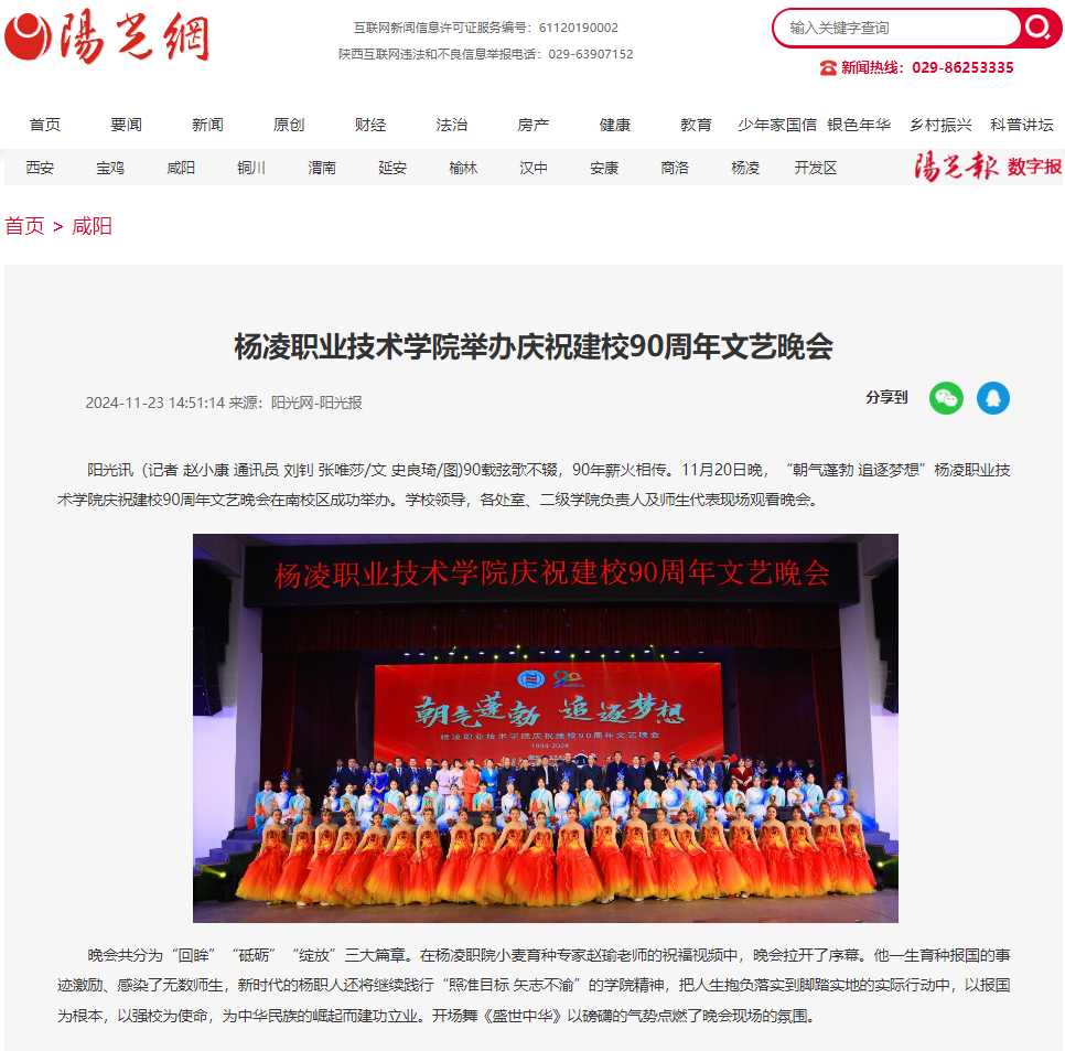 阳光讯(记者 赵小康 通讯员 刘钊 张唯莎/文 史良琦/图)90载弦歌不辍,90年薪火相传。11月20日晚,“朝气蓬勃 追逐梦想”杨凌职业技术学院庆祝建校90周年文艺晚会在南校区成功举办。学校领导,各处室、二级学院负责人及师生代表现场观看晚会。