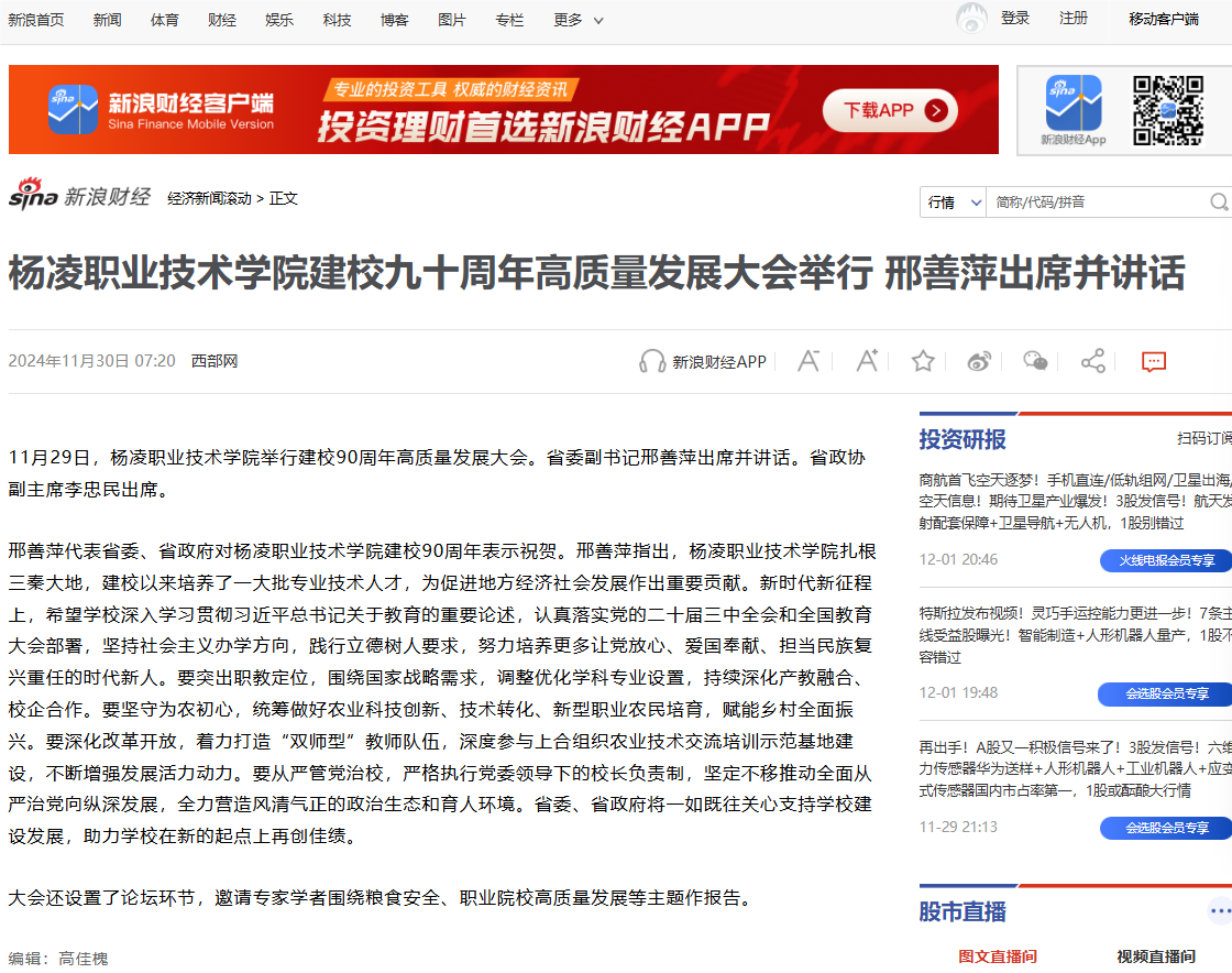 【新浪财经】杨凌职业技术学院建校九十周年高质量发展大会举行 邢善萍出席并讲话