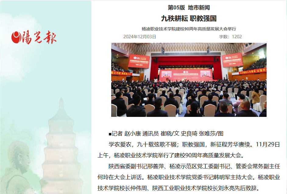 学农爱农,九十载弦歌不辍;职教强国,新征程芳华赓续。11月29日上午,杨凌职业技术学院举行了建校90周年高质量发展大会。