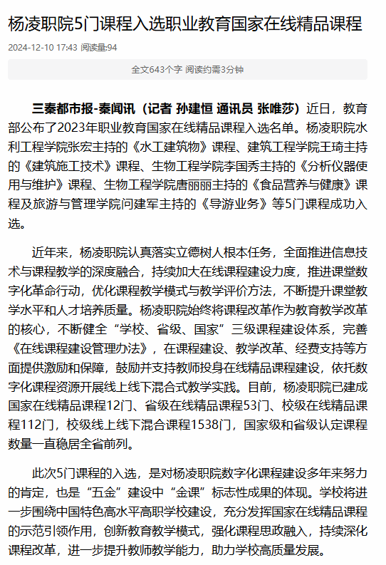 【三秦都市报】杨凌职院5门课程入选职业教育国家在线精品课程