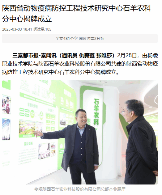 三秦都市报-秦闻讯(通讯员 仇薪鑫 张唯莎)2月28日,由杨凌职业技术学院与陕西石羊农业科技股份有限公司共建的陕西省动物疫病防控工程技术研究中心石羊农科分中心揭牌成立。