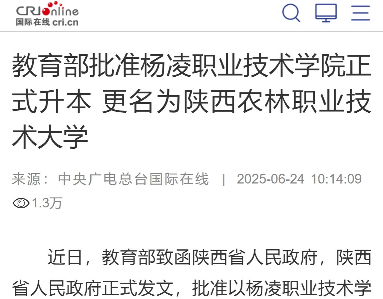 近日,教育部致函陕西省人民政府,陕西省人民政府正式发文,批准以杨凌职业技术学院为基础设立陕西农林职业技术大学。这标志着陕西省公办本科层次职业学校实现“零”的突破。