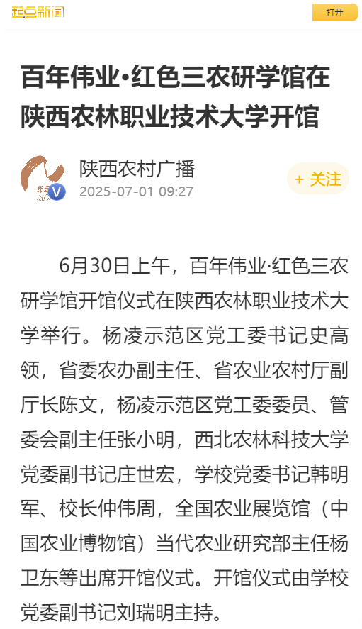 6月30日上午,百年伟业·红色三农研学馆开馆仪式在陕西农林职业技术大学举行。杨凌示范区党工委书记史高领,省委农办副主任、省农业农村厅副厅长陈文,杨凌示范区党工委委员、管委会副主任张小明,西北农林科技大学党委副书记庄世宏,学校党委书记韩明军、校长仲伟周,全国农业展览馆(中国农业博物馆)当代农业研究部主任杨卫东等出席开馆仪式。开馆仪式由学校党委副书记刘瑞明主持。