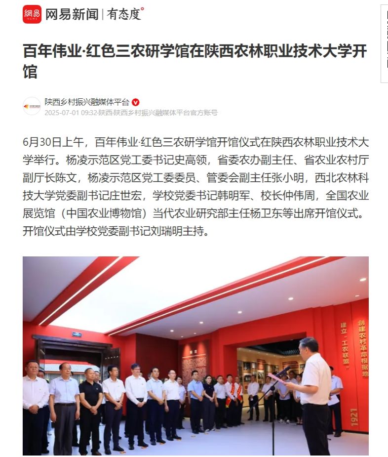 6月30日上午,百年伟业·红色三农研学馆开馆仪式在陕西农林职业技术大学举行。杨凌示范区党工委书记史高领,省委农办副主任、省农业农村厅副厅长陈文,杨凌示范区党工委委员、管委会副主任张小明,西北农林科技大学党委副书记庄世宏,学校党委书记韩明军、校长仲伟周,全国农业展览馆(中国农业博物馆)当代农业研究部主任杨卫东等出席开馆仪式。开馆仪式由学校党委副书记刘瑞明主持。