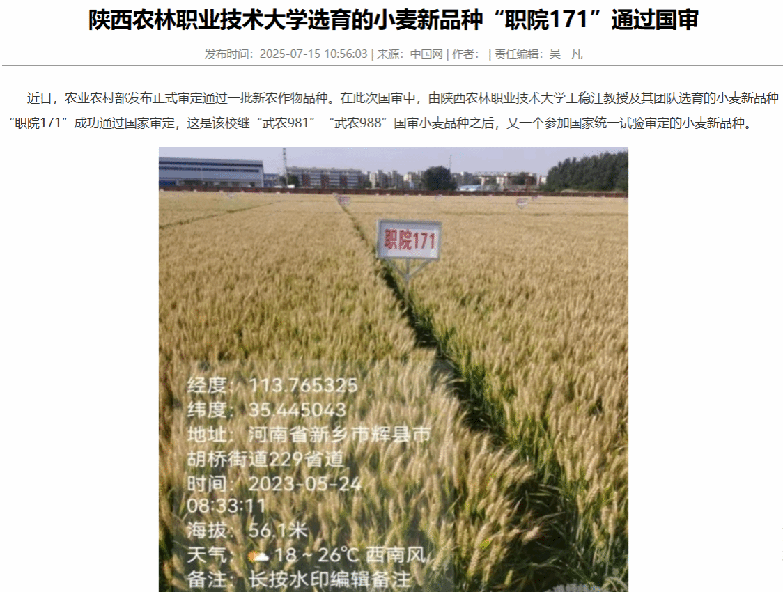 近日,农业农村部发布正式审定通过一批新农作物品种。在此次国审中,由陕西农林职业技术大学王稳江教授及其团队选育的小麦新品种“职院171”成功通过国家审定,这是该校继“武农981”“武农988”国审小麦品种之后,又一个参加国家统一试验审定的小麦新品种。