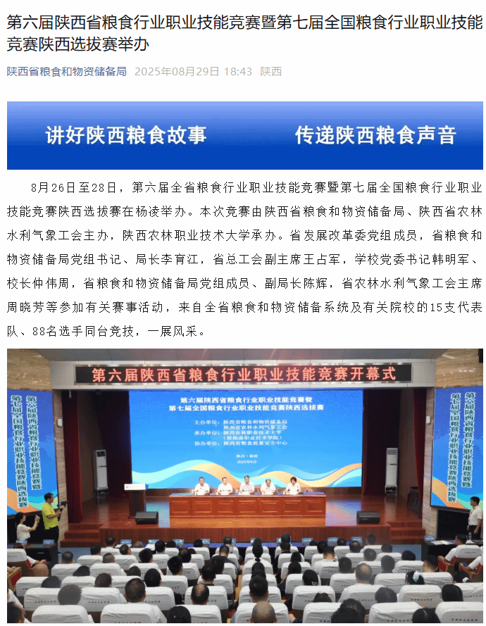 8月26日至28日,第六届全省粮食行业职业技能竞赛暨第七届全国粮食行业职业技能竞赛陕西选拔赛在杨凌举办。本次竞赛由陕西省粮食和物资储备局、陕西省农林水利气象工会主办,陕西农林职业技术大学承办。省发展改革委党组成员,省粮食和物资储备局党组书记、局长李育江,省总工会副主席王占军,学校党委书记韩明军、校长仲伟周,省粮食和物资储备局党组成员、副局长陈辉,省农林水利气象工会主席周晓芳等参加有关赛事活动,来自全省粮食和物资储备系统及有关院校的15支代表队、88名选手同台竞技,一展风采。