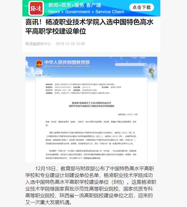 12月18日,教育部与财政部公布了中国特色高水平高职学校和专业建设计划建设单位名单,杨凌职业技术学院成功入选中国特色高水平高职学校建设单位(B档)。这是杨凌职业技术学院继国家首批示范性高等职业院校、国家优质专科高等职业院校、陕西省一流高职院校建设单位之后,迎来的又一次重大发展机遇。
