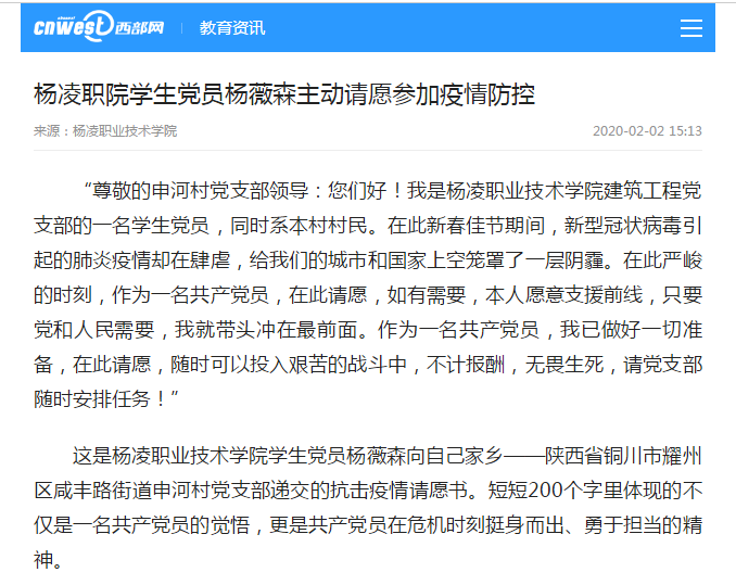 这是杨凌职业技术学院学生党员杨薇森向自己家乡——陕西省铜川市耀州区咸丰路街道申河村党支部递交的抗击疫情请愿书。短短200个字里体现的不仅是一名共产党员的觉悟,更是共产党员在危机时刻挺身而出、勇于担当的精神。