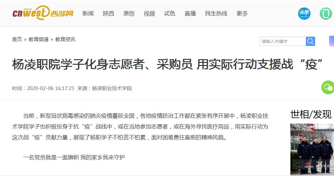 当前,新型冠状病毒感染的肺炎疫情蔓延全国,各地疫情防治工作都在紧张有序开展中,杨凌职业技术学院学子也积极投身于抗“疫”战线中,或在当地参加志愿者,或在海外寻找医疗用品,用实际行动为这次战“疫”贡献力量,展现了杨职学子不怕苦不怕累,面对困难勇往直前的精神风貌。