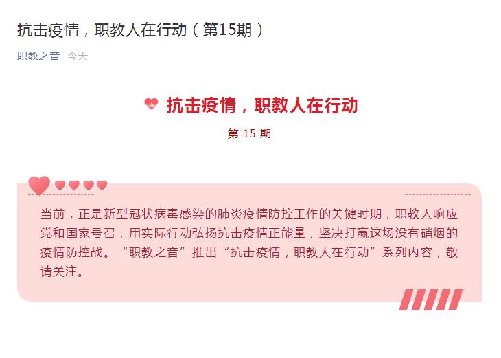 当前,正是新型冠状病毒感染的肺炎疫情防控工作的关键时期,职教人响应党和国家号召,用实际行动弘扬抗击疫情正能量,坚决打赢这场没有硝烟的疫情防控战。“职教之音”推出“抗击疫情,职教人在行动”系列内容,敬请关注。