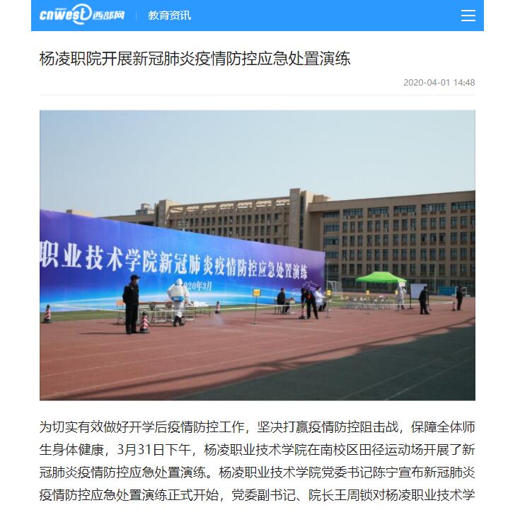 为切实有效做好开学后疫情防控工作,坚决打赢疫情防控阻击战,保障全体师生身体健康,3月31日下午,杨凌职业技术学院在南校区田径运动场开展了新冠肺炎疫情防控应急处置演练。杨凌职业技术学院党委书记陈宁宣布新冠肺炎疫情防控应急处置演练正式开始,党委副书记、院长王周锁对杨凌职业技术学院疫情防控提出明确要求,杨凌示范区党工委委员、管委会副主任袁鸿马到场观摩演练。