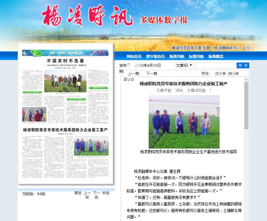 据了解,3月16日至27日,杨凌职业技术学院党员技术服务团的党战平、赵俊侠、尚晓峰、杨振华等6名党员专家教授,亢菊侠、张雯、张迪、吴宽、冯帆等8名青年博士党员,先后走访了杨凌中翼农化有限公司、杨凌千普农业开发有限公司、陕西大唐种业股份有限公司等10余家企业,为企业复工复产提供技术咨询和服务,其中8名博士每人对接一家企业,帮助企业解决遇到的技术难题。