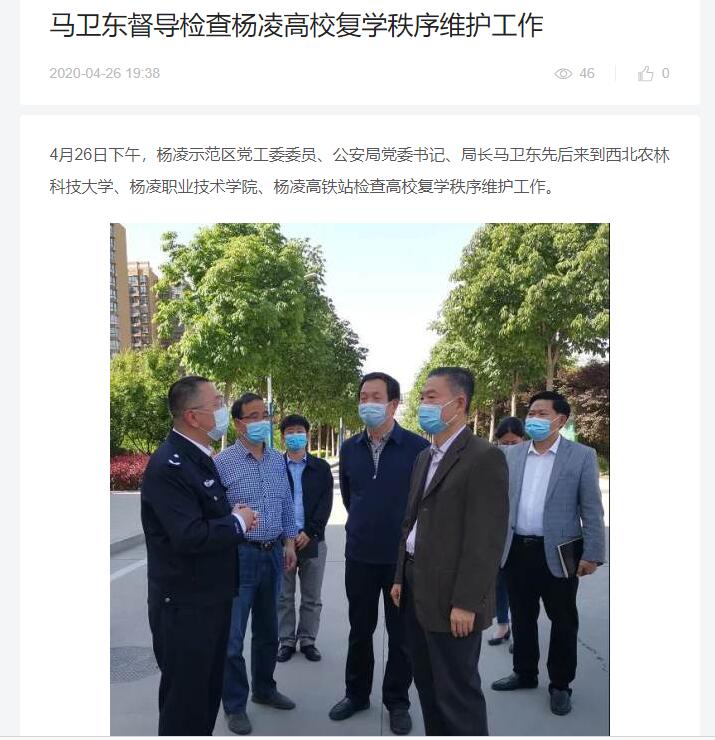 4月26日下午,杨凌示范区党工委委员、公安局党委书记、局长马卫东先后来到西北农林科技大学、杨凌职业技术学院、杨凌高铁站检查高校复学秩序维护工作。