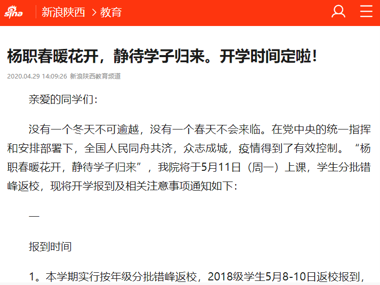 没有一个冬天不可逾越,没有一个春天不会来临。在党中央的统一指挥和安排部署下,全国人民同舟共济,众志成城,疫情得到了有效控制。“杨职春暖花开,静待学子归来”,我院将于5月11日(周一)上课,学生分批错峰返校,现将开学报到及相关注意事项通知如下: