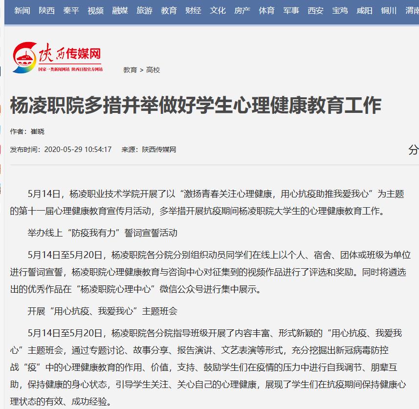 5月14日,杨凌职业技术学院开展了以“激扬青春关注心理健康,用心抗疫助推我爱我心”为主题的第十一届心理健康教育宣传月活动,多举措开展抗疫期间杨凌职院大学生的心理健康教育工作。