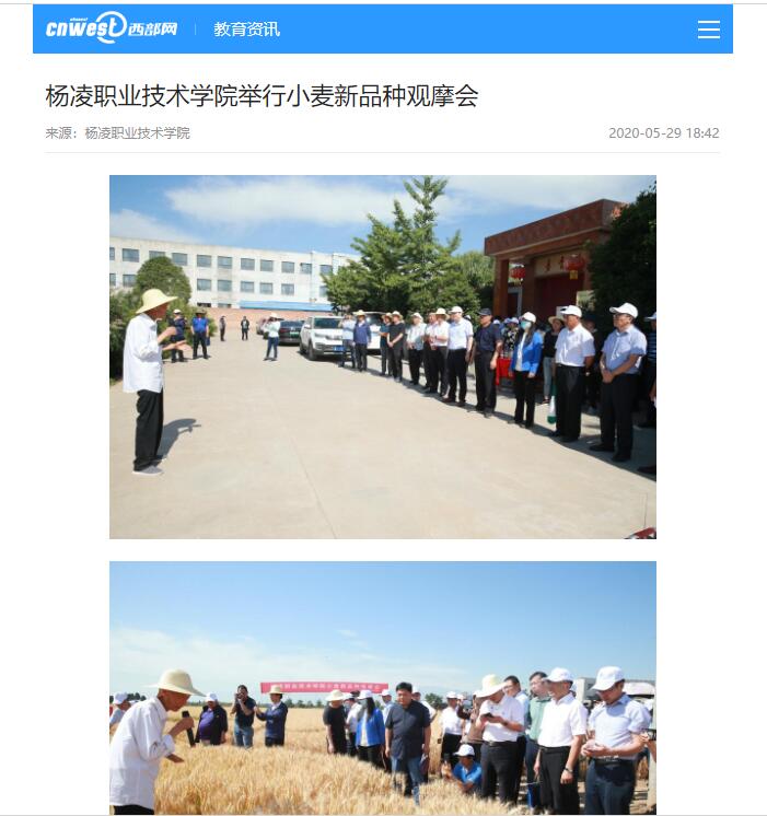5月29日上午,杨凌职业技术学院小麦新品种观摩会在赵瑜小麦研究所(豆村育种基地)和位于杨凌种子产业园的小麦育种产学研基地举行。杨凌职业技术学院党委书记陈宁、副院长祝战斌,陕西省种子工作站站长严勇敢,陕西省科学技术厅农村科教处副处长王德喜,宝鸡市农业农村局局长张周让,宝鸡市农科院书记杜运科,杨凌示范区党工委管委会副秘书长、共建融合办主任陈亚平等参加了观摩会。
