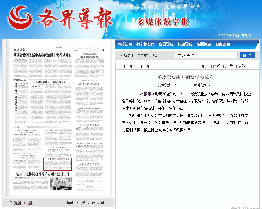 本报讯(海云 崔晓)6月16日,杨凌职业技术学院、南方测绘集团校企合作签约仪式暨南方测绘学院成立大会在杨凌职院举行,合作双方共同为杨凌职院南方测绘学院揭牌,并签订合作协议书。 杨凌职院南方测绘学院的成立,标志着杨凌职院与南方测绘集团在合作办学方面迈出关键一步,对促进产业链、创新链和教育链“三链融合”,实现校企双方互利共赢,推进行业发展将发挥积极作用。